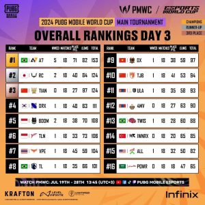 وفي عرض آخر للمواهب العالمية البارزة، جسدت المنافسات على مدار الأيام الثلاثة الماضية روح بطولة كأس عالم ببجي موبايل 2024 الافتتاحية عبر الأرقام القياسية والمفاجآت المستمرة. وكانت الأجواء مذهلة في ساحة الاتحاد السعودي للرياضات الإلكترونية، حيث تابع المشجعون كل ثانية بشغف كبير. وكان أفضل دليل على ذلك هي التغييرات التي ظهرت في قائمة المتصدرين من اليوم الأول وحتى اليوم الثالث، حيث شهد صعود Vampire Esports من المركز الأخير إلى السابع، وقفز Tianba من المركز الثامن إلى الثالث. ورأينا في ختام اليوم الثاني تمركز Alpha 7 Esports في صدارة قائمة المتصدرين بأربعة انتصارات، يليه فريق REJECT المنافس عن كثب الذي تغلب عليه سابقاً ليحصل على تاج بطولة ببجي موبايل العالمية المفتوحة 2024.