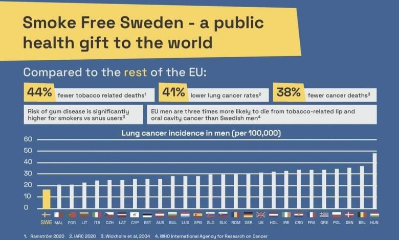 كانت الحكومة السويدية قد أعلنت تنفيذها العديد من البرامج التثقيفية لمواطنيها، للتوعية بمخاطر التدخين، والتي تتضمن إتاحة تداول منتجات التدخين البديلة، سواء السجائر الإلكترونية أو التبغ المسخن وغيرها من منتجات حديثة أثبتت العديد من الدراسات العلمية أنها أقل خطورة مقارنة بالسجائر التقليدية، بجانب نشر المعلومات الموثوقة الخاصة بالمنتجات الحديثة، لمساعدتهم على الإقلاع.