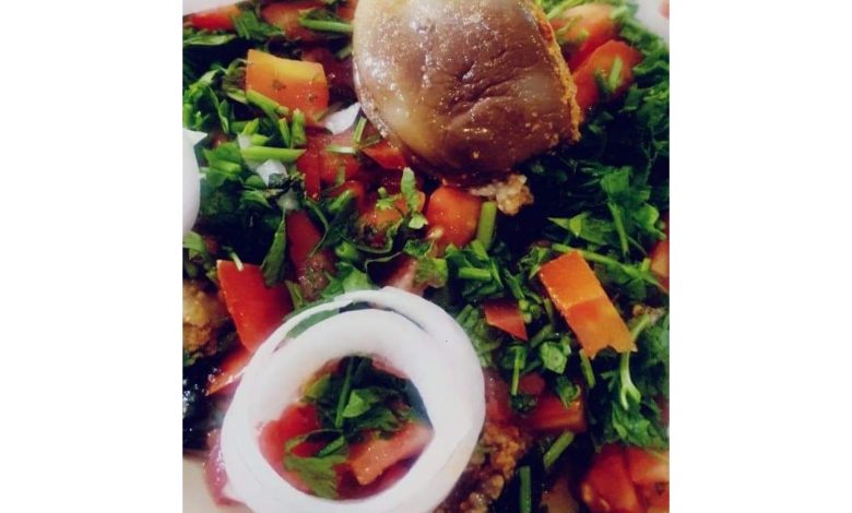 نجهز الخضار نغسلها ونفرمها ونضع المكونات بطبق التقديم ونقلبهم