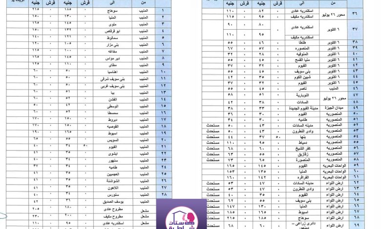 تعريفة خطوط السير والتنقل من محافظة الجيزة الي المحافظات المجاورة او المرتبطة بخطوط مشتركة ..