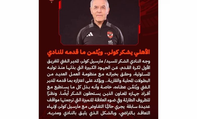 الأهلي في بيان رسمي: الأهلي يشكر كولر.. ويُثمن ما قدمه للنادي من جهود كبيرة