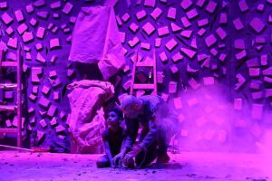من ناحيته، أوضح أحمد محمد فهمي منفذ الديكور، أنه تم الاستعانة بتصميمات تعكس حالة العزلة والانفصال عن العالم الخارجي، كالتكوينات الصخرية التي بدت وبها بعض التشققات لإبراز الشعور بالانكسار والعجز عن التواصل مع العالم الخارجي،