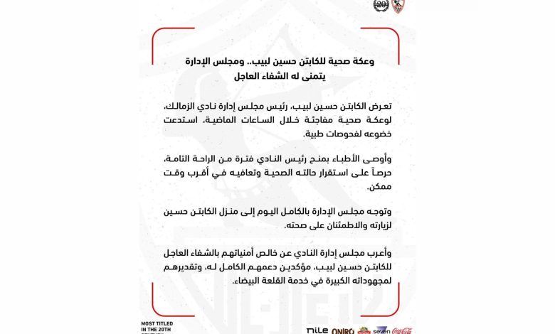 تعرض الكابتن حسين لبيب لوعكة صحية متابعه شريف منصور أعلن نادي الزمالك عبر صفحته الرسمية عن تعرض رئيس لوعكة صحيه اليوم.