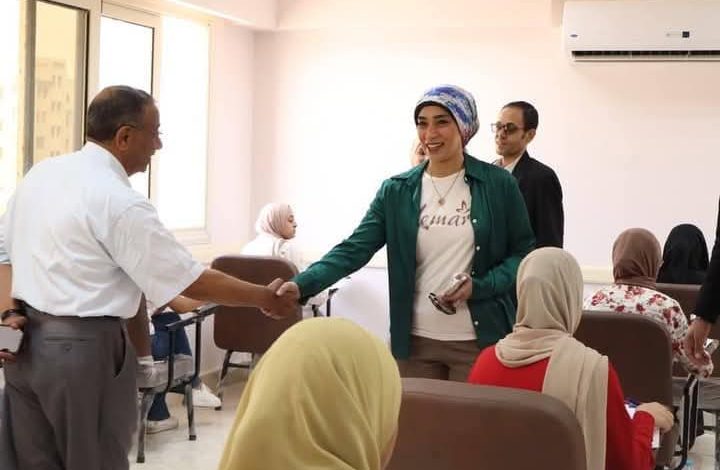 وكان في استقبالها الدكتور وليد عبد الله، عميد كلية التربية، والدكتور رمضان عيد القلماوي، وكيل الكلية لشئون التعليم والطلاب، والدكتور صلاح شعبان حسانين، وكيل الكلية للدراسات العليا والبحوث، والسيد محمود إبراهيم، أمين الكلية، إلى جانب أعضاء هيئة التدريس بالكلية.