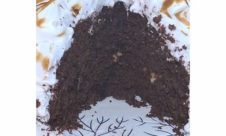 تم نضع لها المرنغ هو عبارة على 3 بياض البيض نضيف كاس سكر ورشة ملح نضعه فوق الكيكة ونضع له شاليمو اذا امكن او نذخلها اى الفرن لتحمر وتأخذ لون ذهبي كما هي موضحة في الصورة شهية طيبة