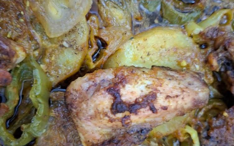 تم ناخد صينية نضع فيها زيت ونضع بطاطا دوائر والبصل والفلفل أخضر والحار تم نضيف عليهم خليط أجنحة دجاج