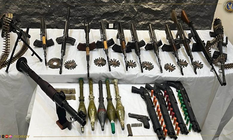 بشأن تحديد مكان إختباء (عنصر جنائى شديد الخطورة محكوم عليه بالإعدام والسجن المؤبد فى جنايات “قتل عمد ، سلاح ، سرقة بالإكراه ، بلطجة” ومطلوب ضبطه وإحضاره فى قضايا “إطلاق أعيرة نارية ، قتل عمد، مقاومة سلطات”) ومصرعه عقب تبادل لإطلاق النيران مع قوات الشرطة بالجيزة .. فقد وردت معلومات تؤكد قيام العنصر المذكور بإخفاء أسلحة نارية بقطعة أرض بدائرة مركز شرطة ديروط بأسيوط، وعقب تقنين الإجراءات تم إستهدافها وعثر بها على ( 18 قطعة سلاح نارى “مدفع أر بى جى ، 2 رشاش جرينوف ، 10 بنادق آلية، 4 بنادق خرطوش ، طبنجة – عدد من الطلقات مختلفة الأعيرة).