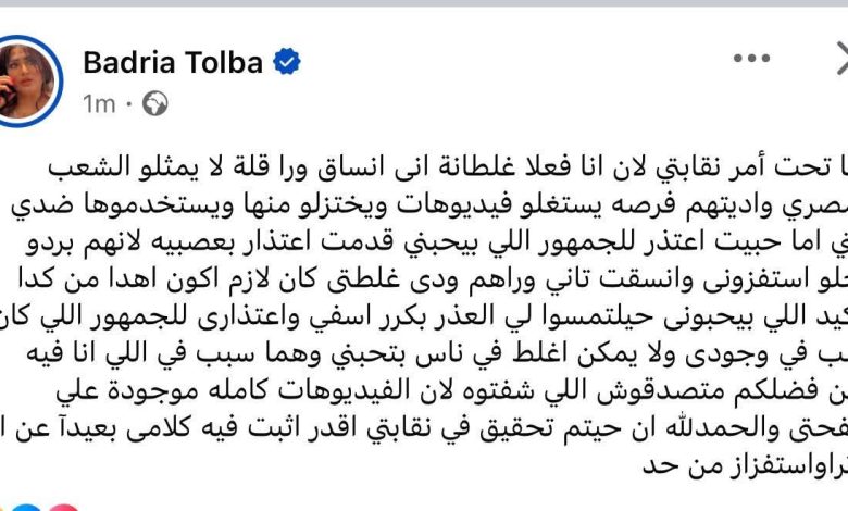 بدرية_طلبة بعد تحويلها للتحقيق متابعة غاده المصري … " انا تحت امر نقابتى لاني غلطانة واديت قلة لا تمثل المصريين فرصة لاستغلالي "
