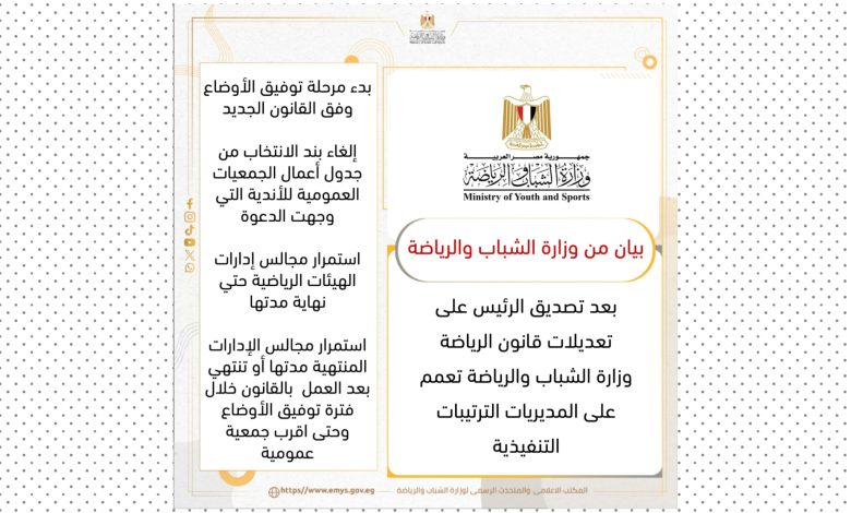 وأصدرت الوزارة تعميماً إلى مديري مديريات الشباب والرياضة على مستوى الجمهورية، تضمن توضيحاً دقيقاً للترتيبات القانونية الخاصة بعمل مجالس إدارات الهيئات الرياضية، حيث نصّ القانون على استمرار المجالس القائمة وقت العمل به في مباشرة مهامها حتى نهاية مدتها، على أن يُعاد تشكيلها – سواء بالانتخاب أو التعيين – وفقاً للنظم الأساسية المعدلة.