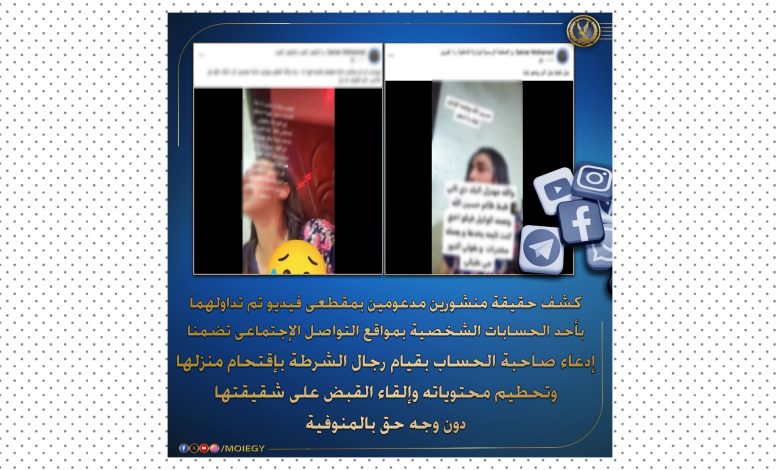 بمواقع التواصل الإجتماعى تضمنا إدعاء صاحبة الحساب بقيام رجال الشرطة بإقتحام منزلها وتحطيم محتوياته وإلقاء القبض على شقيقتها دون وجه حق بالمنوفية.