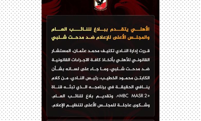 النادى الأهلي يتقدم ببلاغ للنائب العام والمجلس الأعلى للإعلام متابعة غاده المصري ضد مدحت شلبي بعد تصريحات ملفقه لكابتن محمود الخطيب
