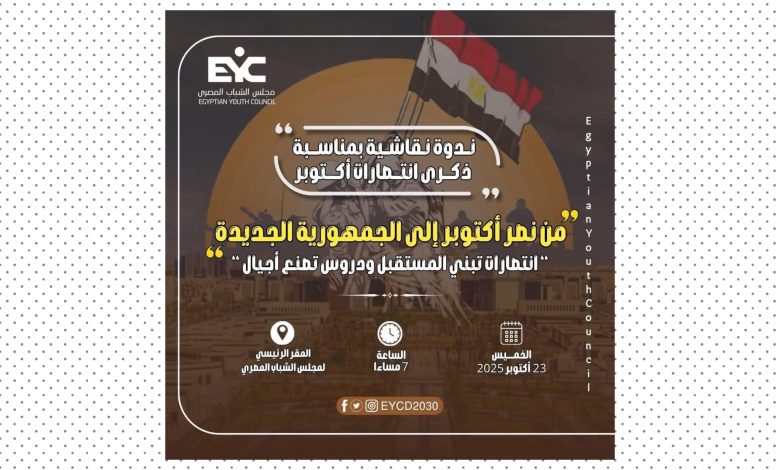 أعلنت داليا الحزاوي، المنسق العام للبرنامج الوطني لتعزيز الحق في التعليم بمجلس الشباب المصري، عن إقامة ندوة نقاشية، تحت شعار «من نصر أكتوبر إلي الجمهورية الجديدة انتصارات تبني المستقبل ودروس تصنع أجيال »، يوم الخميس القادم الموافق ٢٣ أكتوبر الساعة السابعة مساءً، وذلك بمقر مجلس الشباب المصري