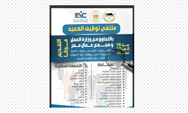 قد أعلن مجلس الشباب المصري بالتعاون مع مجمع عمال مصر، وتحت رعاية معالي الوزير/ محمد جبران – وزير العمل، عن إطلاق “ملتقى توظيف شمال الصعيد” الأضخم من نوعه.