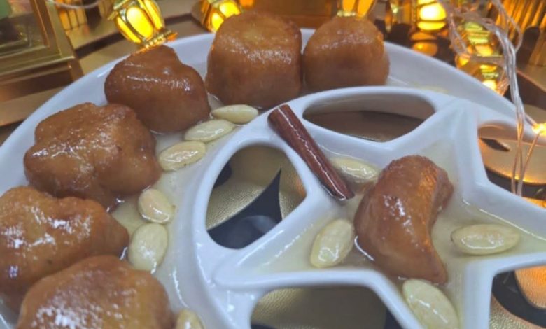 تم ناخد صحن نضع فيه سيرو وشباح الصفرة ونضع عليها لوز لتزين كما هي موضحة في الصورة