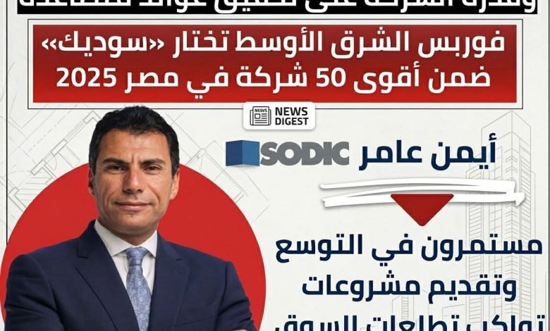 أعلنت مؤسسة “فوربس الشرق الأوسط” عن قائمتها السنوية لأقوى 50 شركة في مصر لعام 2025، حيث نجحت شركة “سوديك” (شركة السادس من أكتوبر للتنمية والاستثمار) في حجز مقعدها ضمن نخبة الشركات المصرية، استناداً إلى مؤشرات مالية صلبة تعكس كفاءة الإدارة وقدرة الشركة المستمرة على تحقيق عوائد متصاعدة لمساهميها.