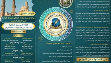 بين أصالة المنهج ورقمنة الأدوات.. انطلاق ملتقى “رُوَّاد الوعي” بجامعة الأزهر: الأحد، 26 أبريل 2026م